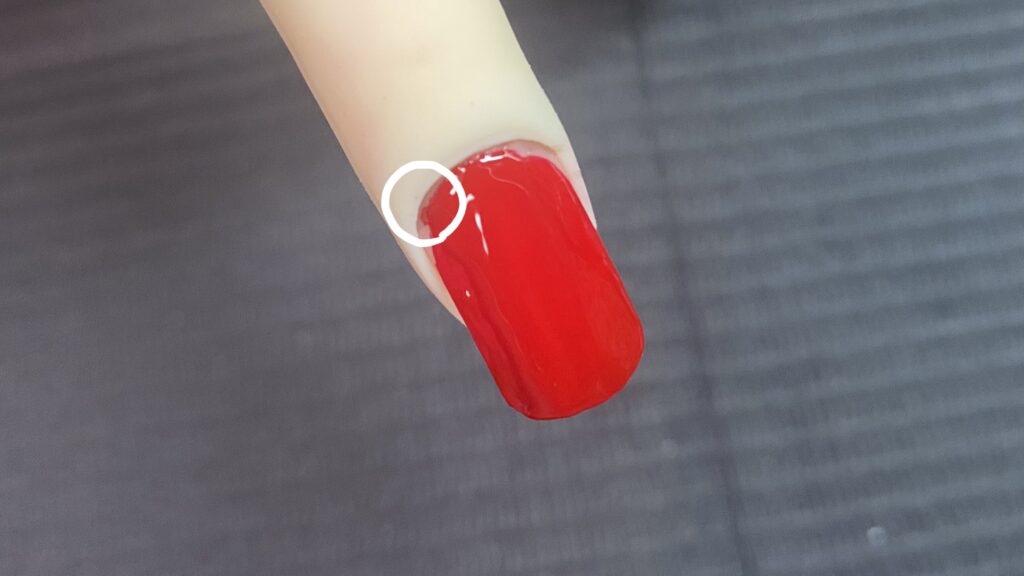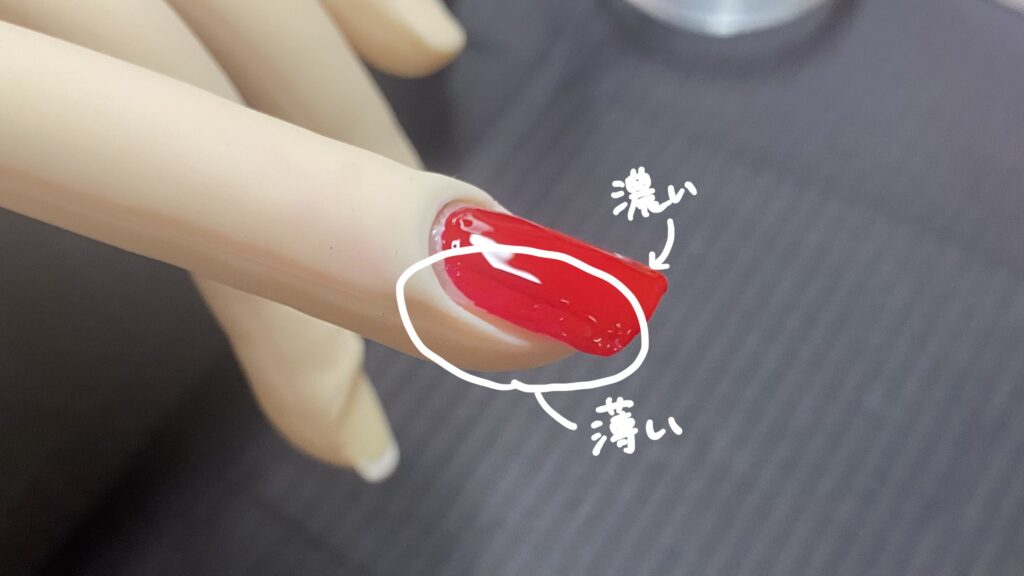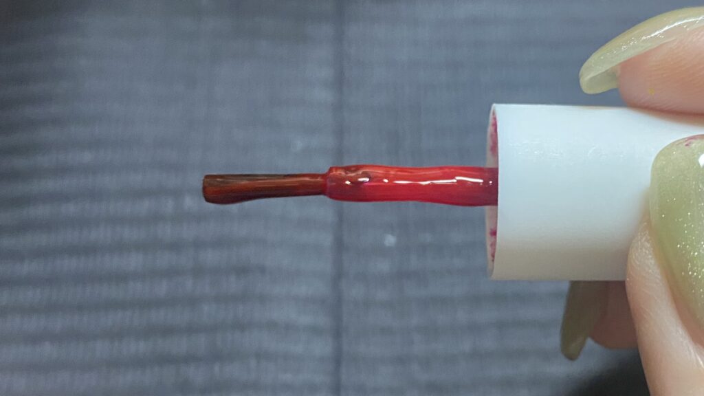 ポリッシュを取る際、容器の入り口で片面をしごくと扱いやすくなります。ハケ形を整えるイメージです。