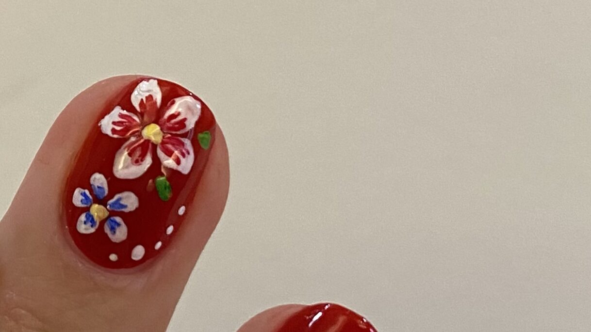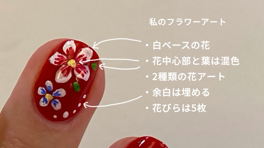ほぼこれで決まりです! 赤ポリッシュに最も映える白色と、バラや複雑な花、4枚(クローバーっぽくなる)でもなく5枚の花。絵の得意な方は構いませんが、誰でも・時間内に描き切り、花と判断されやすいのが「5枚・白色」の良いところです。